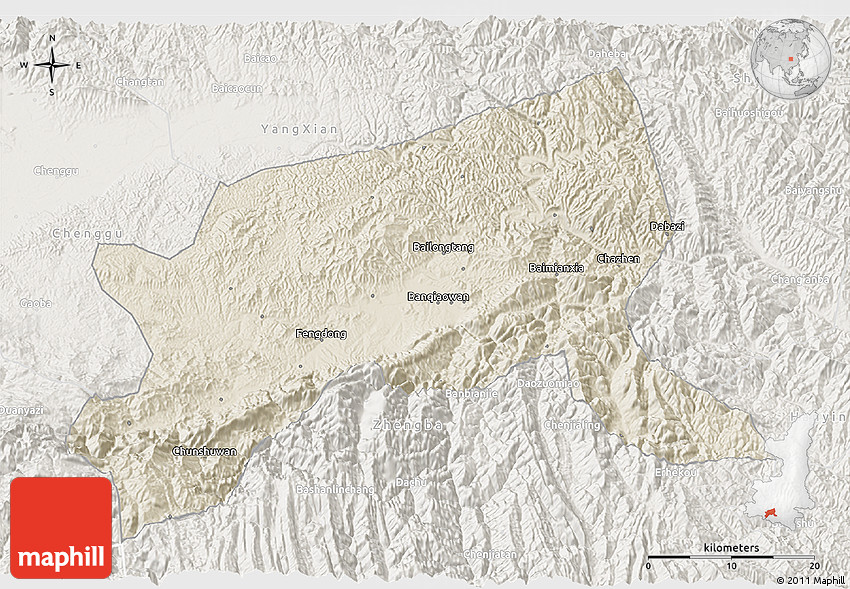 Shaded relief map shows landscape features, such as mountains, valleys and plateaus. Flat areas are smooth on the map, areas with steep slopes and mountains appear more rough. The above map of Xixiang was created using a digital elevation model.