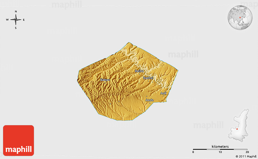 Each map type offers different information and each map style is designed for a different purpose. Read about the styles and map projection used in the above map (Physical 3D Map of Yongshou, single color outside).