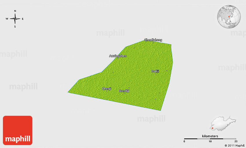 Physical map illustrates the mountains, lowlands, oceans, lakes and rivers and other physical landscape features of Dingtao. Differences in land elevations relative to the sea level are represented by color.