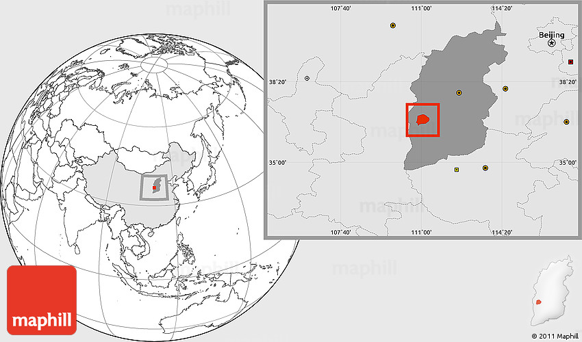 Maphill is a collection of map images. This image combines a blank map with the globe centered on Xi Xian. Use the buttons under the image to switch to different map types.