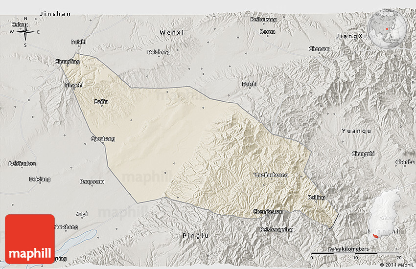 Shaded relief map shows landscape features, such as mountains, valleys and plateaus. Flat areas are smooth on the map, areas with steep slopes and mountains appear more rough. The above map of Xia Xian was created using a digital elevation model.