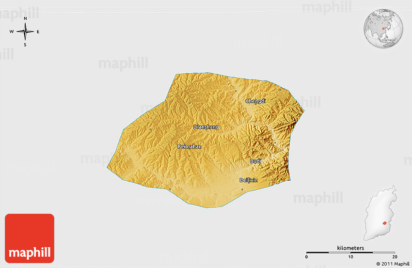 Each map type offers different information and each map style is designed for a different purpose. Read about the styles and map projection used in the above map (Physical 3D Map of Xiangyuan, single color outside).