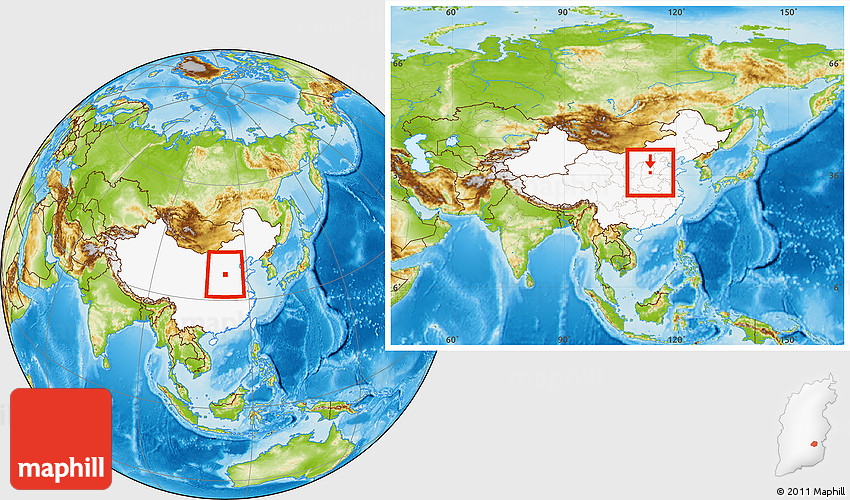 Maphill is a collection of map images. This image combines a physical map with the globe centered on Xiangyuan. Use the buttons under the image to switch to different map types.