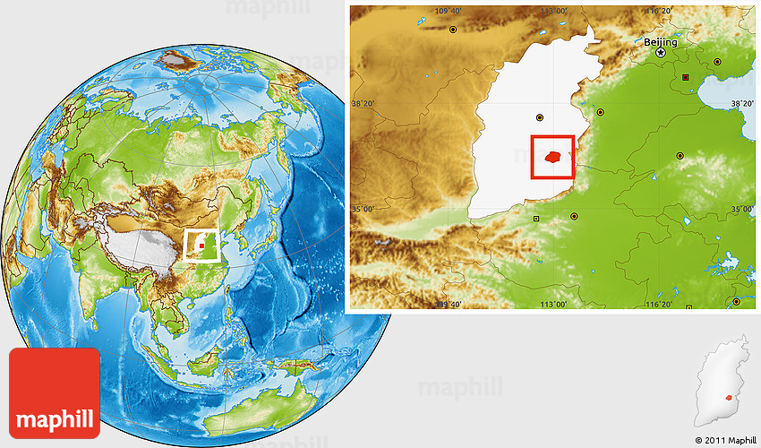 Maphill is a collection of map images. This image combines a physical map with the globe centered on Xiangyuan. Use the buttons under the image to switch to different map types.