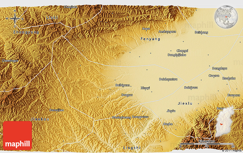 Physical map illustrates the mountains, lowlands, oceans, lakes and rivers and other physical landscape features of Xiaoyi. Differences in land elevations relative to the sea level are represented by color.