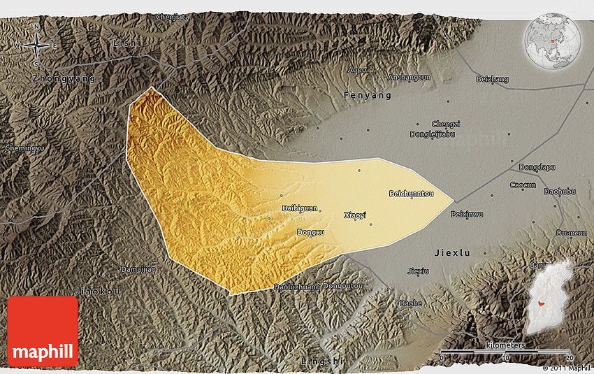 The 3D physical map represents one of several map types and styles available. Look at Xiaoyi, Shanxi, China from different perspectives.