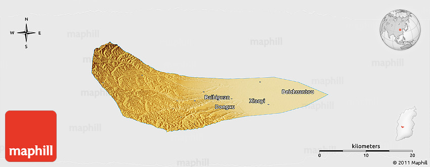 Physical map illustrates the mountains, lowlands, oceans, lakes and rivers and other physical landscape features of Xiaoyi. Differences in land elevations relative to the sea level are represented by color.