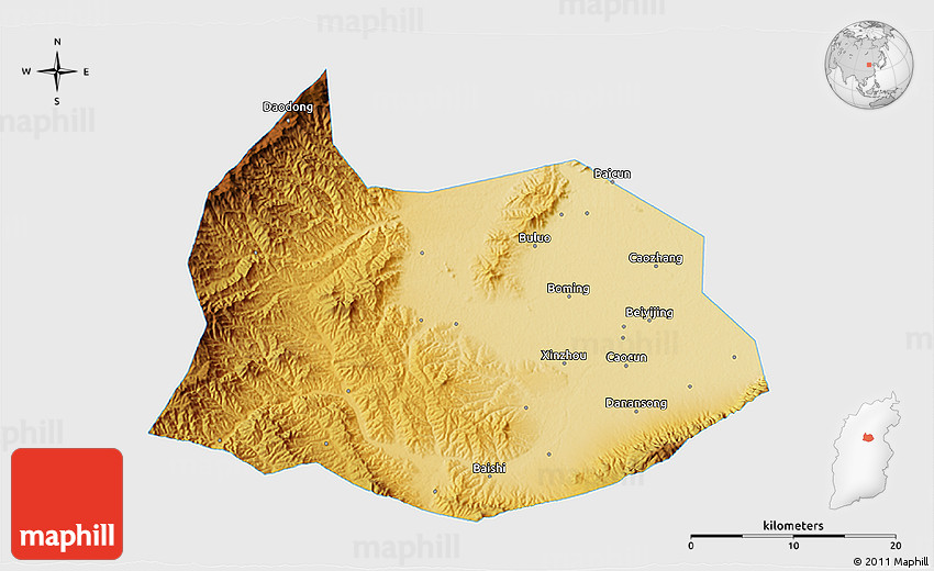 Physical map illustrates the mountains, lowlands, oceans, lakes and rivers and other physical landscape features of Xin Xian. Differences in land elevations relative to the sea level are represented by color.