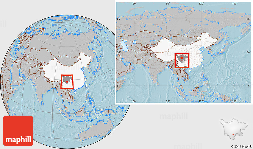 Maphill is a collection of map images. This image combines a gray map with the globe centered on Xide. Use the buttons under the image to switch to different map types.