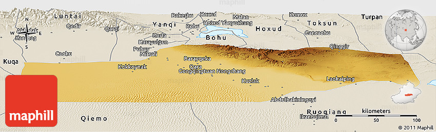 The panoramic physical map represents one of several map types and styles available. Look at Yuli, Xinjiang Uygur, China from different perspectives.