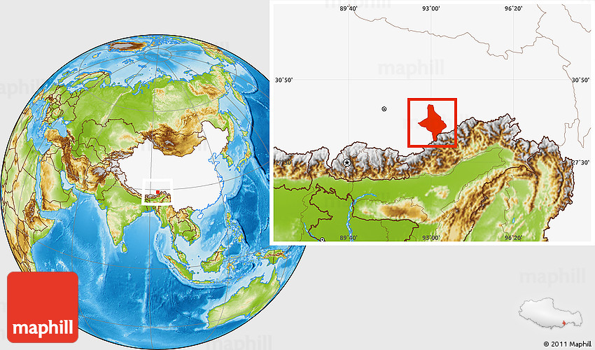 Maphill is a collection of map images. This image combines a physical map with the globe centered on Nang Xian. Use the buttons under the image to switch to different map types.
