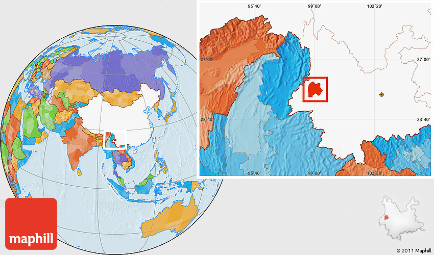 Maphill is a collection of map images. This image combines a political map with the globe centered on Baoshan. Use the buttons under the image to switch to different map types.