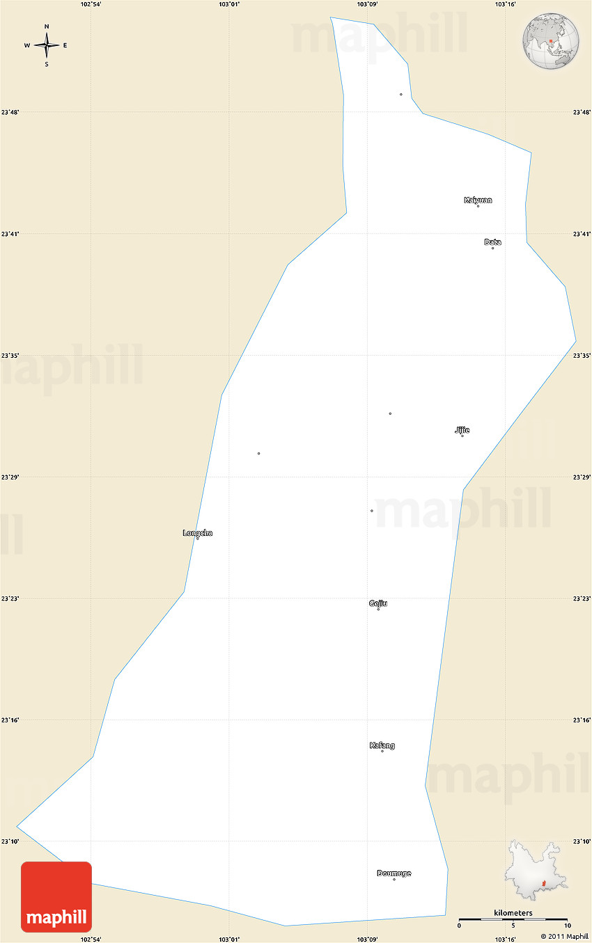 The simple classic style outline map represents one of several map types and styles available. Look at Gejiu Shi, Yunnan, China from different perspectives.