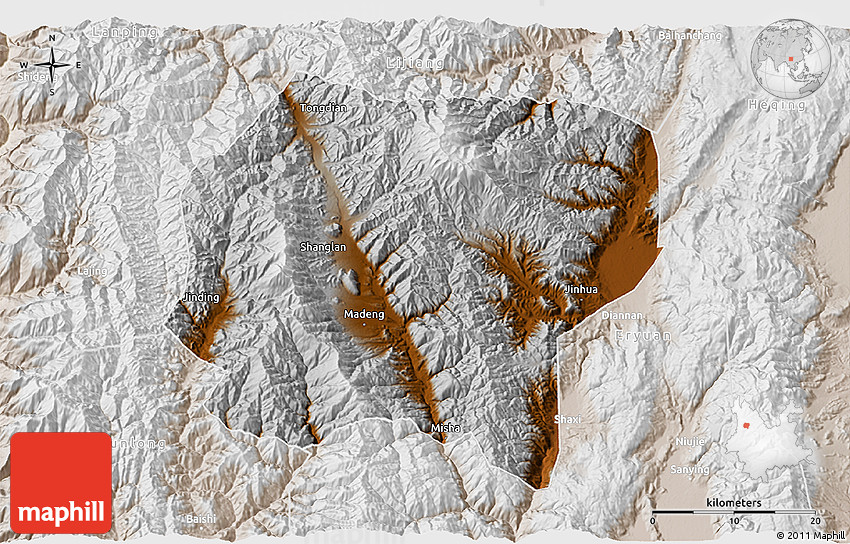 Each map type offers different information and each map style is designed for a different purpose. Read about the styles and map projection used in the above map (Physical 3D Map of Jianchuan, lighten).