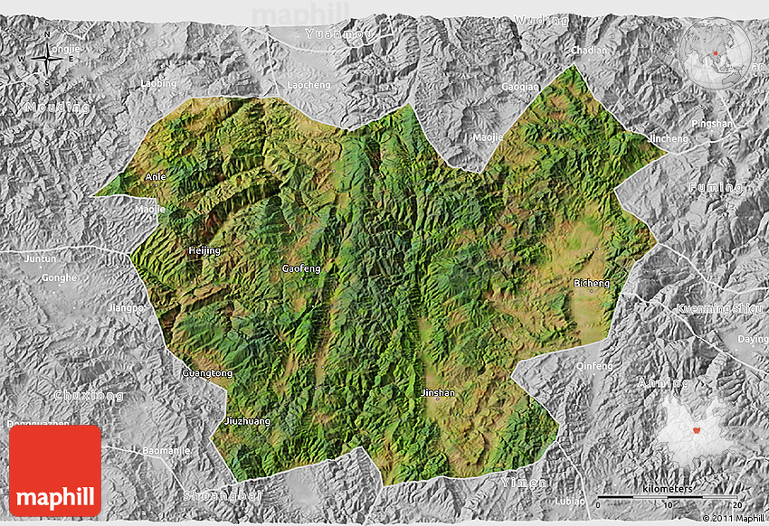 Each map type offers different information and each map style is designed for a different purpose. Read about the styles and map projection used in the above map (Satellite 3D Map of Lufeng, lighten, desaturated).