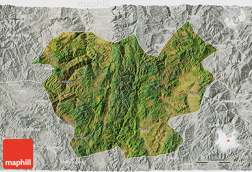 The 3D satellite map represents one of several map types and styles available. Look at Lufeng, Yunnan, China from different perspectives.