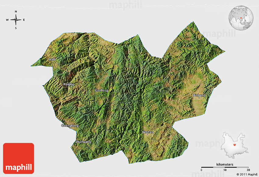 The 3D satellite map represents one of several map types and styles available. Look at Lufeng, Yunnan, China from different perspectives.