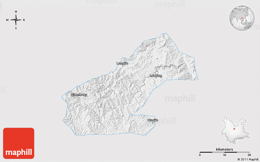 Each map type offers different information and each map style is designed for a different purpose. Read about the styles and map projection used in the above map (Silver Style 3D Map of Mouding, single color outside).