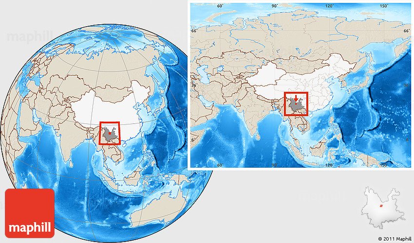 Maphill is a collection of map images. This image combines a shaded relief map with the globe centered on Mouding. Use the buttons under the image to switch to different map types.