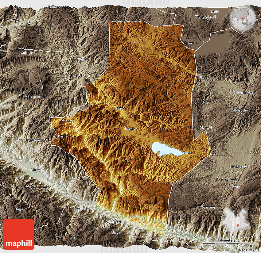 Physical map illustrates the mountains, lowlands, oceans, lakes and rivers and other physical landscape features of Shiping. Differences in land elevations relative to the sea level are represented by color.