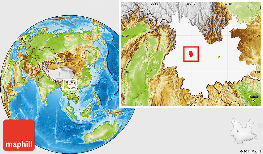Maphill is a collection of map images. This image combines a physical map with the globe centered on Weishan. Use the buttons under the image to switch to different map types.