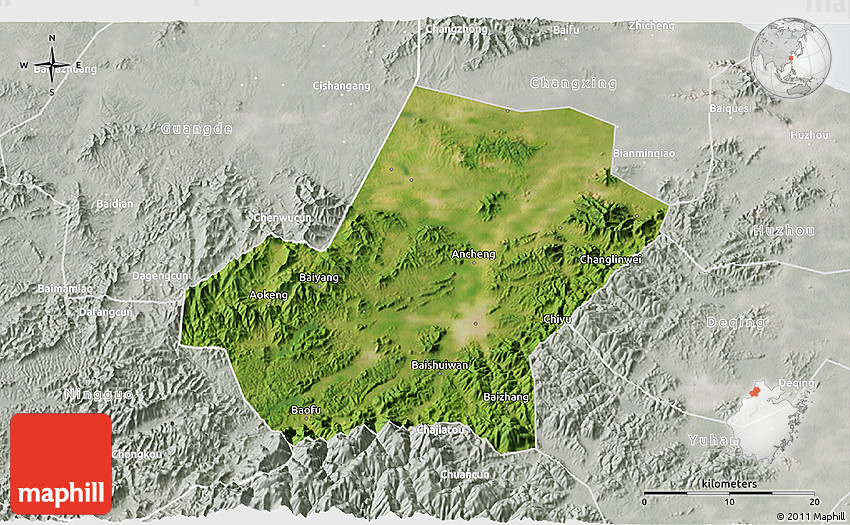 Maphill is a collection of map images. This view of Anji at an angle of 60° is one of these images. Click on the Detailed button under the map for a more comprehensive map.