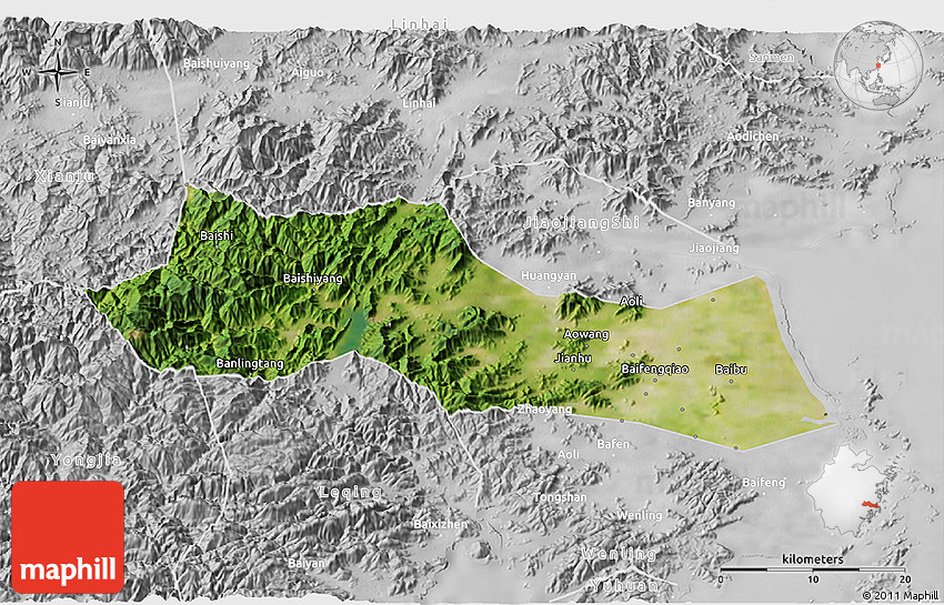 Each map type offers different information and each map style is designed for a different purpose. Read about the styles and map projection used in the above map (Satellite 3D Map of Huangyan, lighten, desaturated).