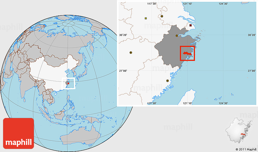 Maphill is a collection of map images. This image combines a gray map with the globe centered on Huangyan. Use the buttons under the image to switch to different map types.