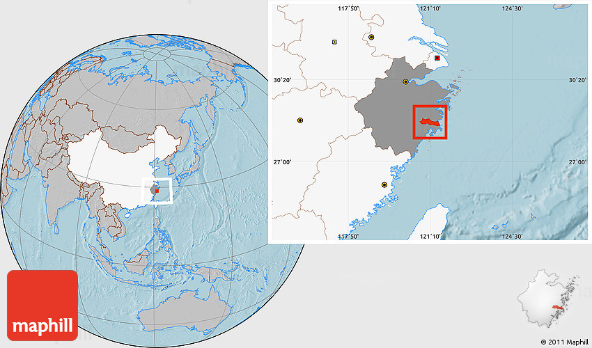 Maphill is a collection of map images. This image combines a gray map with the globe centered on Huangyan. Use the buttons under the image to switch to different map types.