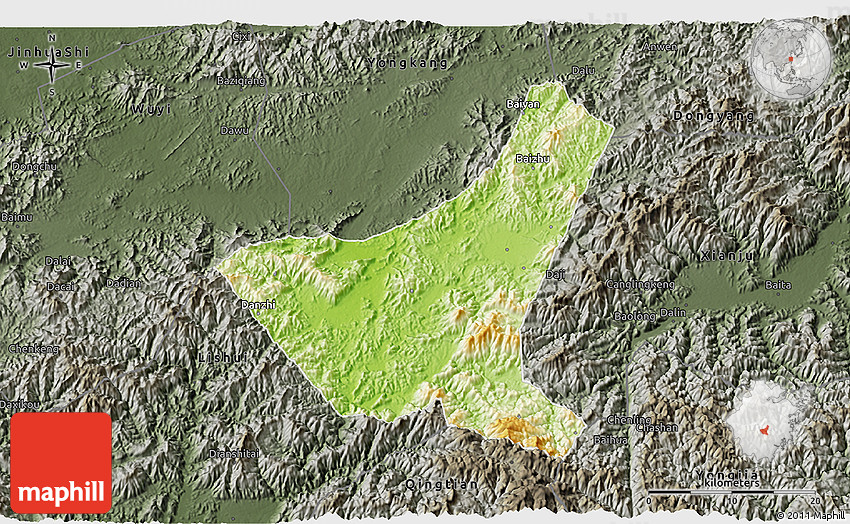 Each map type offers different information and each map style is designed for a different purpose. Read about the styles and map projection used in the above map (Physical 3D Map of Jiyun, darken, semi-desaturated).