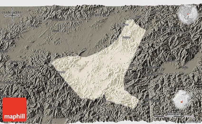 Shaded relief map shows landscape features, such as mountains, valleys and plateaus. Flat areas are smooth on the map, areas with steep slopes and mountains appear more rough. The above map of Jiyun was created using a digital elevation model.