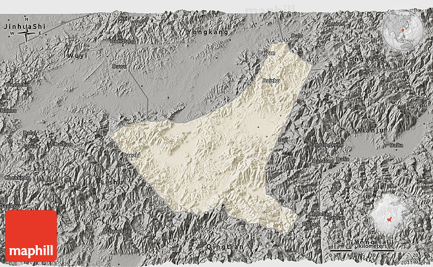 Shaded relief map shows landscape features, such as mountains, valleys and plateaus. Flat areas are smooth on the map, areas with steep slopes and mountains appear more rough. The above map of Jiyun was created using a digital elevation model.