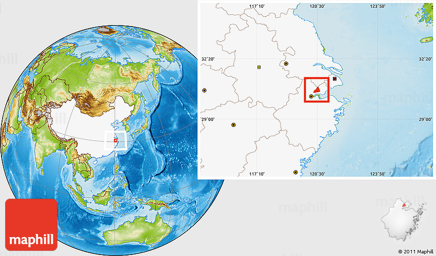 Maphill is a collection of map images. This image combines a physical map with the globe centered on Tongxiang. Use the buttons under the image to switch to different map types.