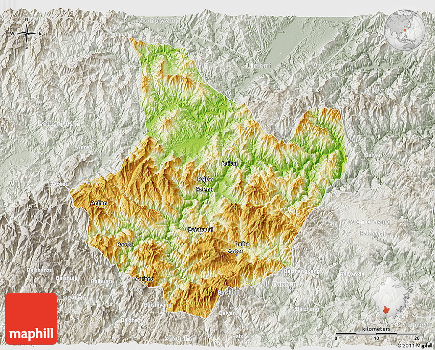 The 3D physical map represents one of several map types and styles available. Look at Yunhe, Zhejiang, China from different perspectives.