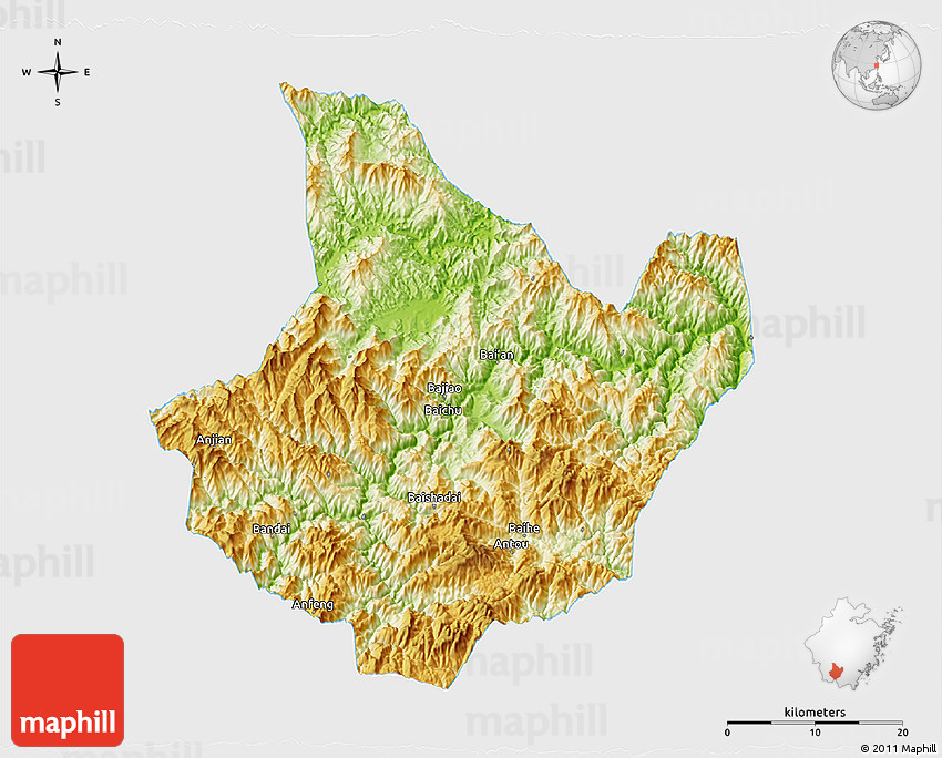 Each map type offers different information and each map style is designed for a different purpose. Read about the styles and map projection used in the above map (Physical 3D Map of Yunhe, single color outside).
