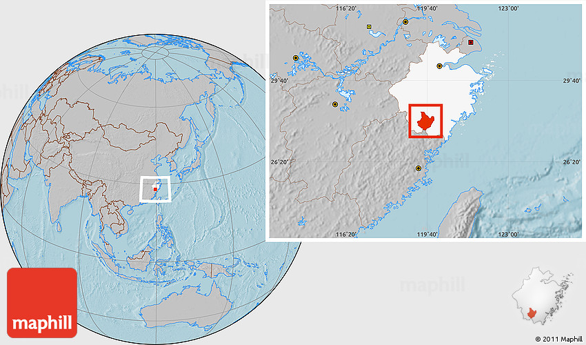 Maphill is a collection of map images. This image combines a gray map with the globe centered on Yunhe. Use the buttons under the image to switch to different map types.