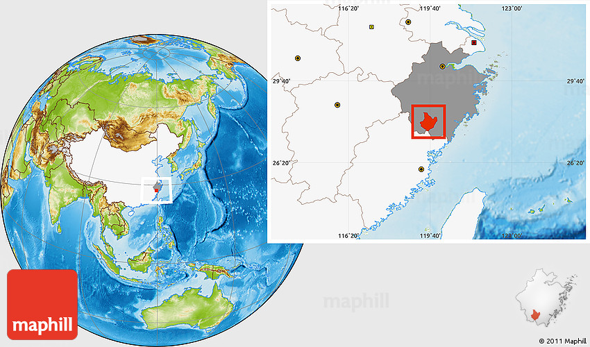 Maphill is a collection of map images. This image combines a physical map with the globe centered on Yunhe. Use the buttons under the image to switch to different map types.