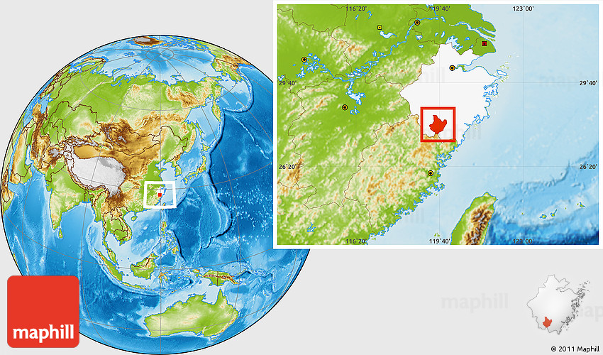 Maphill is a collection of map images. This image combines a physical map with the globe centered on Yunhe. Use the buttons under the image to switch to different map types.