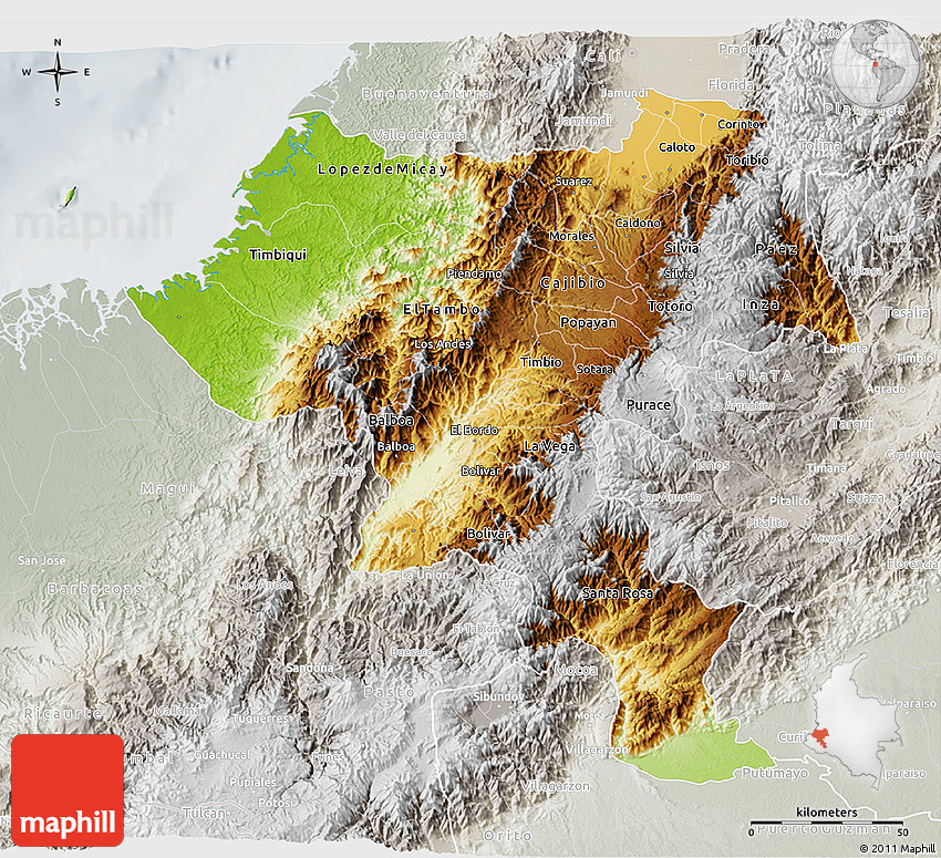 Physical map illustrates the mountains, lowlands, oceans, lakes and rivers and other physical landscape features of Cauca. Differences in land elevations relative to the sea level are represented by color.
