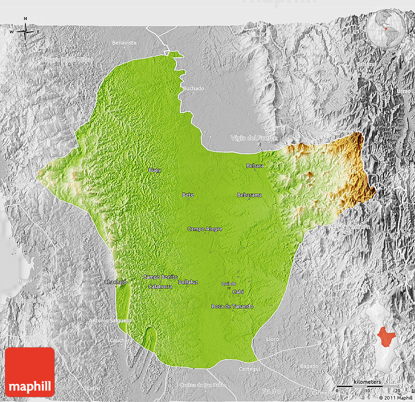 Physical map illustrates the mountains, lowlands, oceans, lakes and rivers and other physical landscape features of Quibdo. Differences in land elevations relative to the sea level are represented by color.
