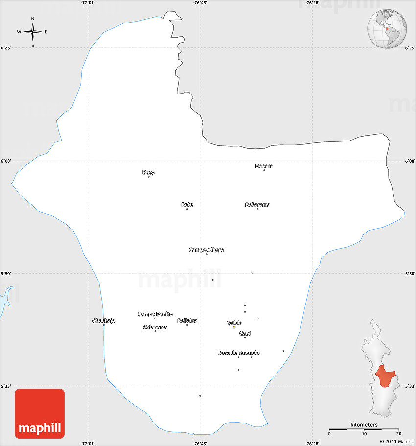 The simple silver style outline map represents one of several map types and styles available. Look at Quibdo, Choco, Colombia from different perspectives.
