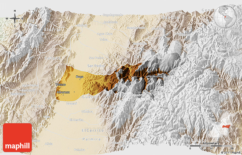 The 3D physical map represents one of several map types and styles available. Look at Buga, Valle del Cauca, Colombia from different perspectives.