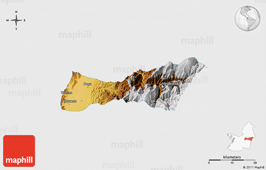 The 3D physical map represents one of several map types and styles available. Look at Buga, Valle del Cauca, Colombia from different perspectives.