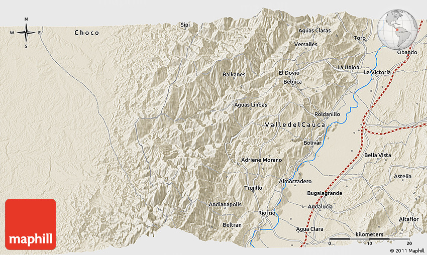 The 3D shaded relief map represents one of many map types and styles available. Look at San Fernando, Zarzal, Valle del Cauca, Colombia from different perspectives.
