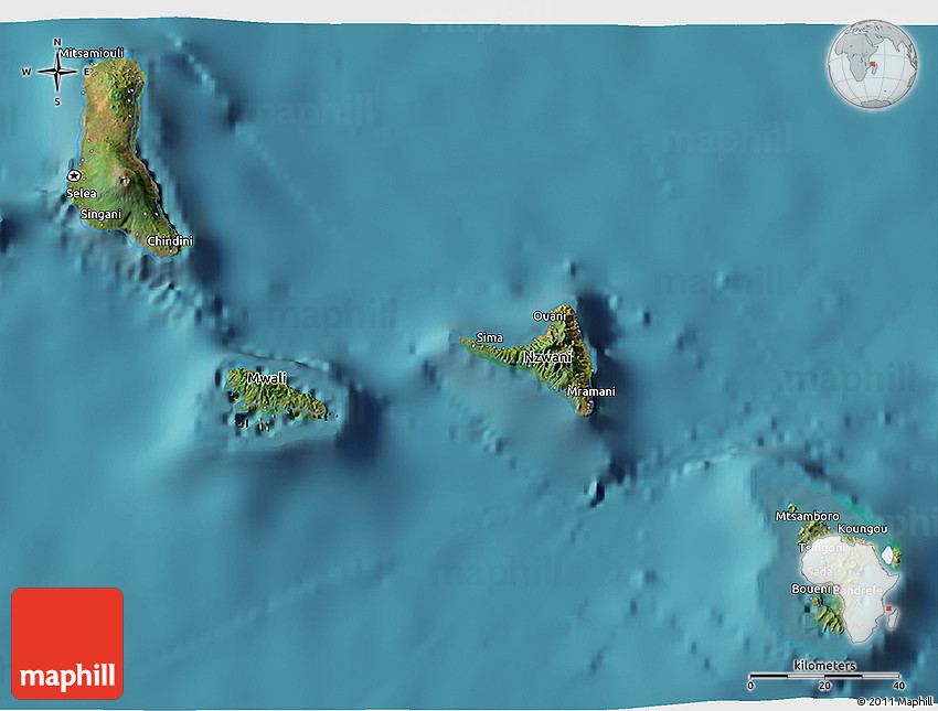 The 3D satellite map represents one of many map types and styles available. Look at Comoros from different perspectives.
