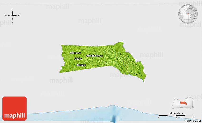 Physical map illustrates the mountains, lowlands, oceans, lakes and rivers and other physical landscape features of Anyama. Differences in land elevations relative to the sea level are represented by color.