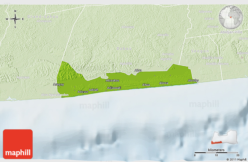 The 3D physical map represents one of several map types and styles available. Look at Jacqueville, Abidjan, Cote d'Ivoire from different perspectives.