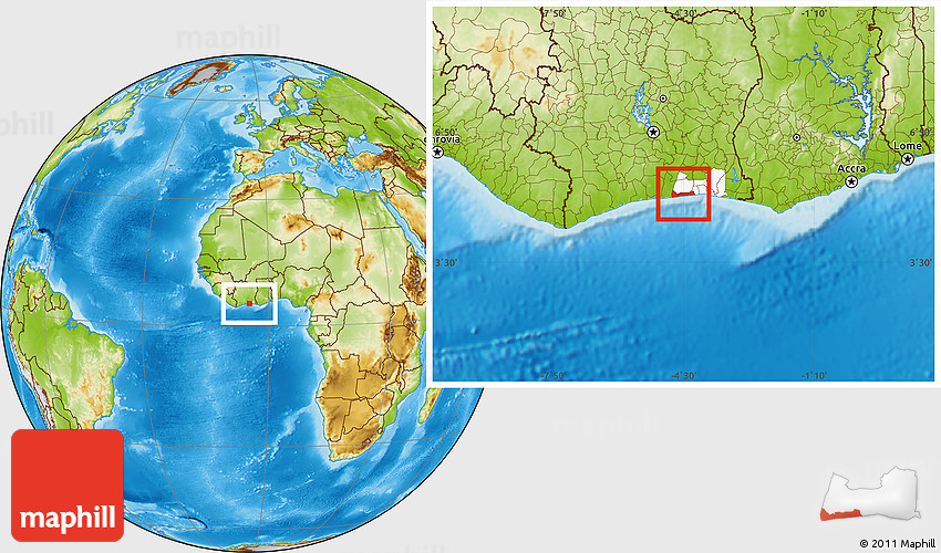 Maphill is a collection of map images. This image combines a physical map with the globe centered on Jacqueville. Use the buttons under the image to switch to different map types.
