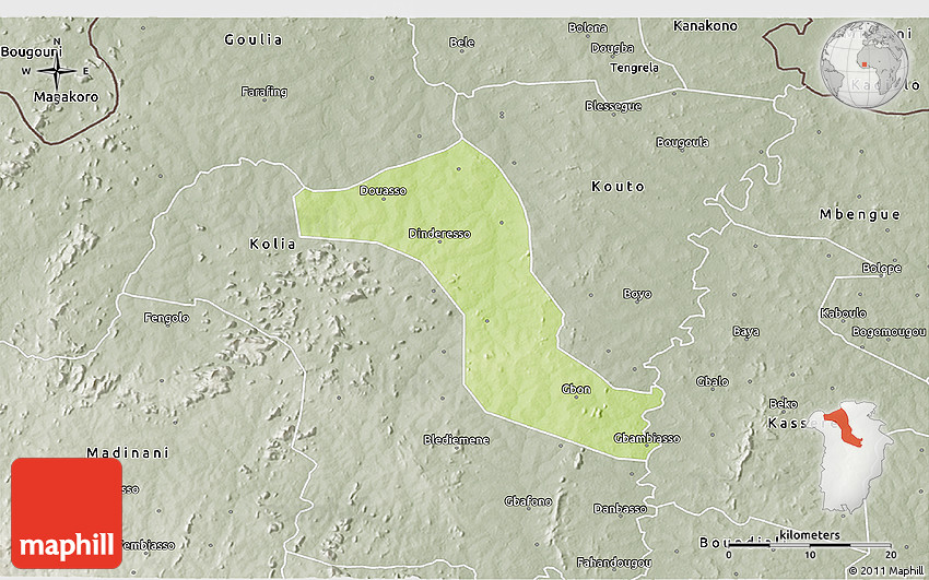 The 3D physical map represents one of several map types and styles available. Look at Gbon, Boundiali, Cote d'Ivoire from different perspectives.