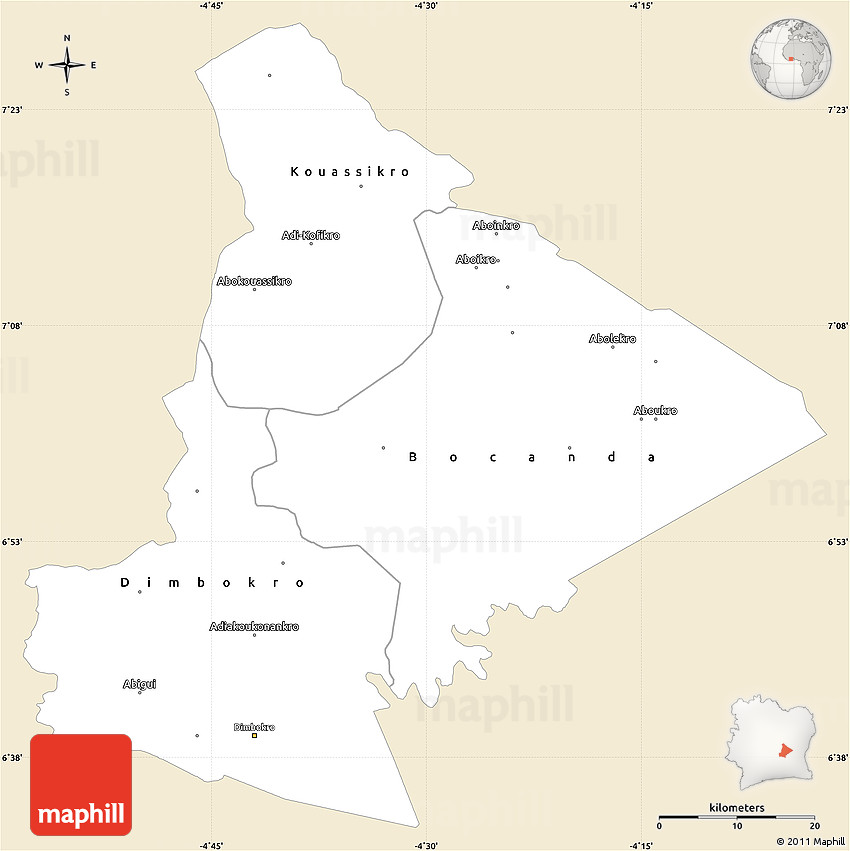 Maphill is a collection of map graphics. This simple outline map of Dimbokro is one of these images. Use the buttons under the image to switch to more comprehensive and detailed map types.